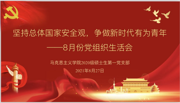 “安而不忘危,存而不忘亡,治而不忘亂。”為深入學習習近平總書記關于總體國家安全觀的重大戰略思想和持續推進落實黨史學習教育。2021年8月27日我院2020級碩士生第一黨支部在騰訊會議上開展8月題為“堅持總體國家安全觀,争做新時代有為青年”的黨日活動。本次主題黨日活動由支部書記張澤民主持,支部全體黨員和部分積極分子共同參與學習和讨論。